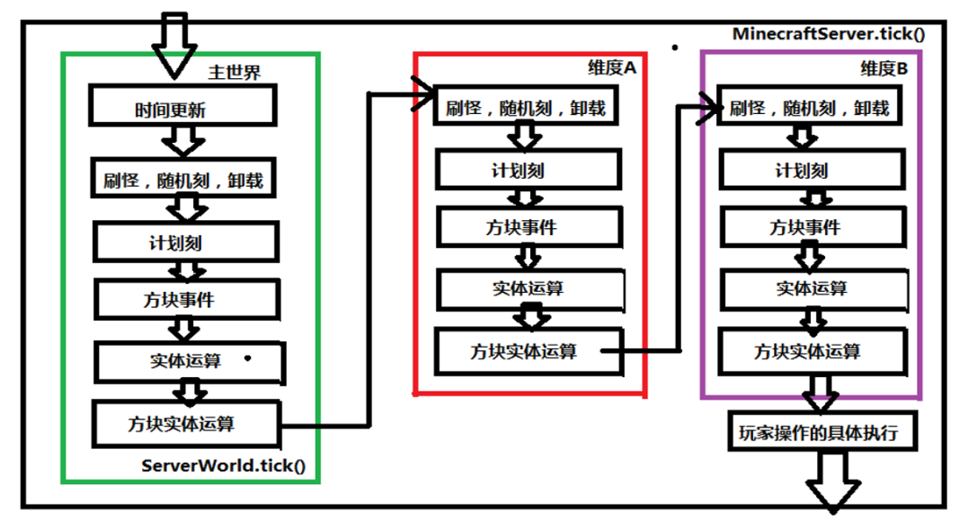 众所周知,原版Minecraft服务端(含客户端内置的服务端)的主线运算是单线程的,也就是说Minecraft服务端不会在同一时间运算多个维度、进行多个运算阶段或者运算多个实体。所以,可以给出Minecraft服务端每tick的运算流程大概如下: